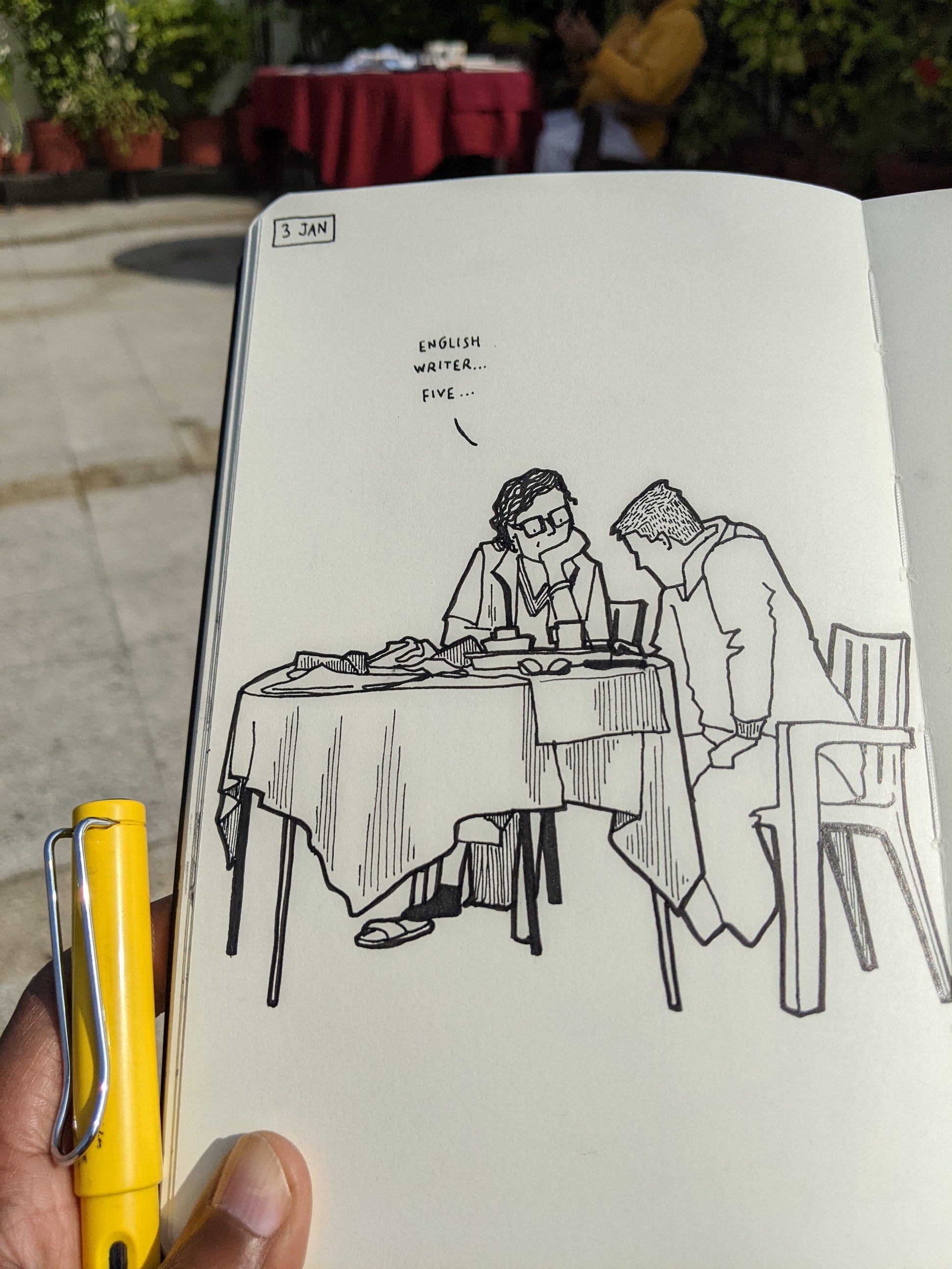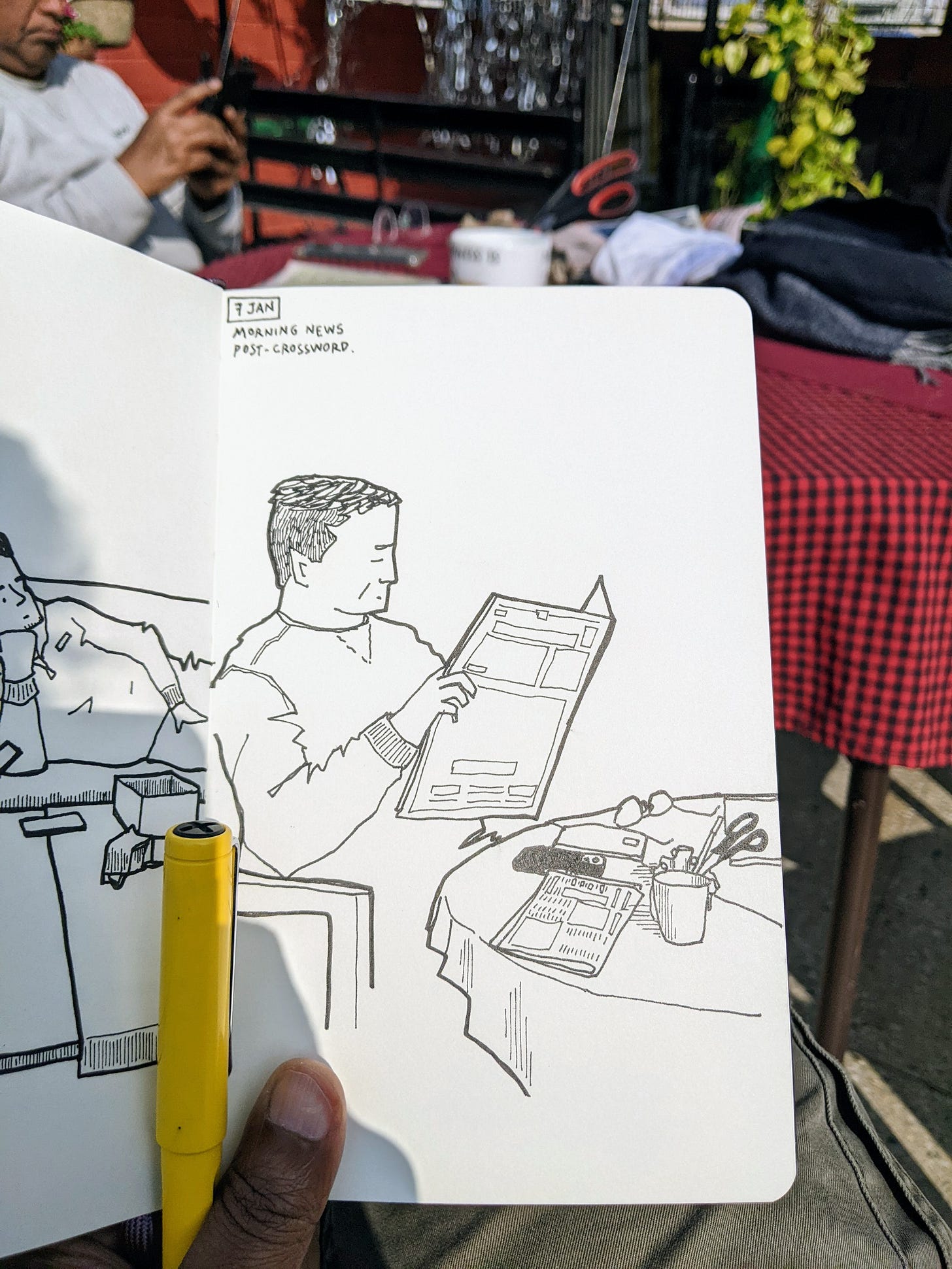 This morning, we solved the crossword together again, and I sat at the same table.