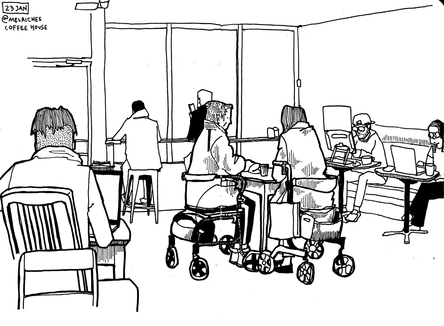 I ordered my coffee (black, small) and prepared to head towards the window when I saw the two elderly ladies in the middle of the cafe. From where I stood, they were framed on all sides by young whippersnappers typing something or the other on their laptops, plugged into their headphones. Connected, yet utterly disconnected.