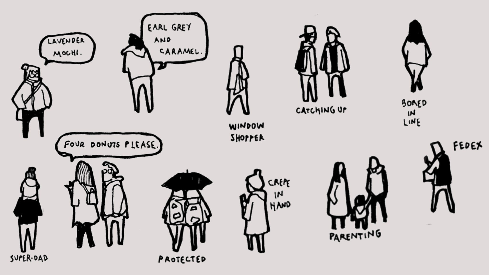I went up on the #15 bus, then walked along Broadway Ave to get to Gene Coffee Bar, which occupies a triangular space at a curious fork on Main St. It’s a unique location where the narrow triangular seating area gives a wide view of two busy streets. A fertile ground for TinyPeople!