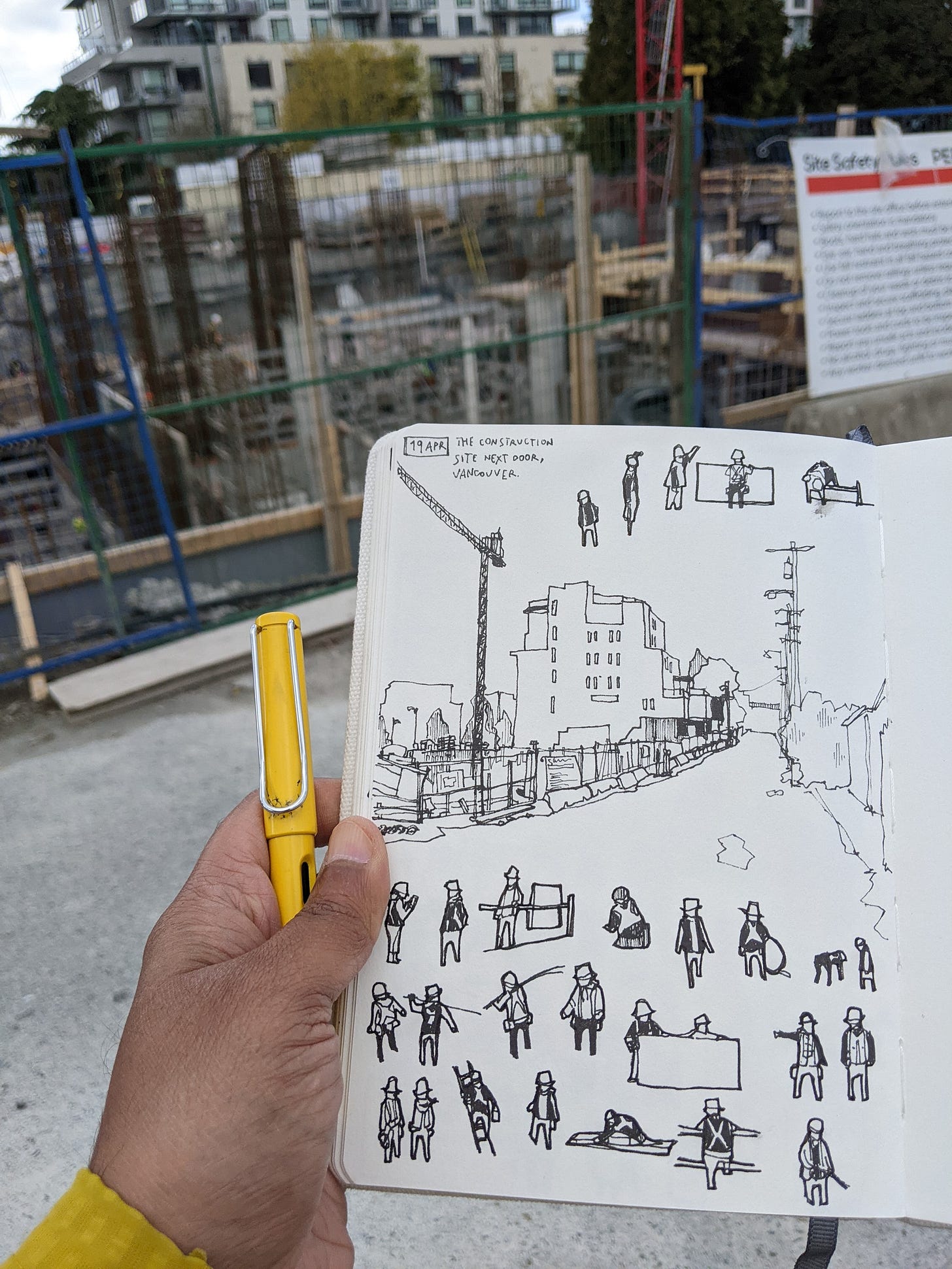 There is a construction site near my home. I have been wanting to draw the workers for a long time. Today was just the right day to do it.
