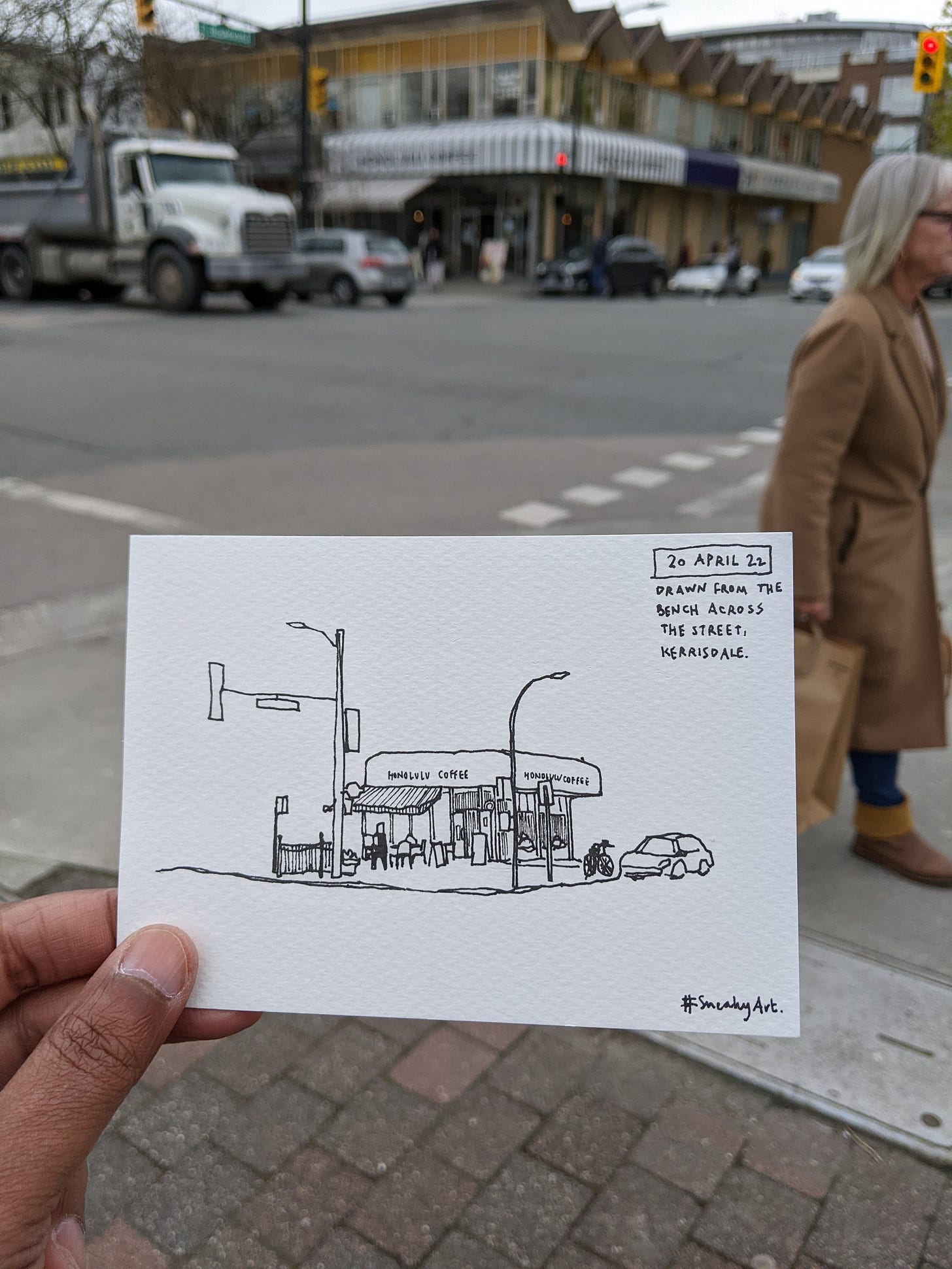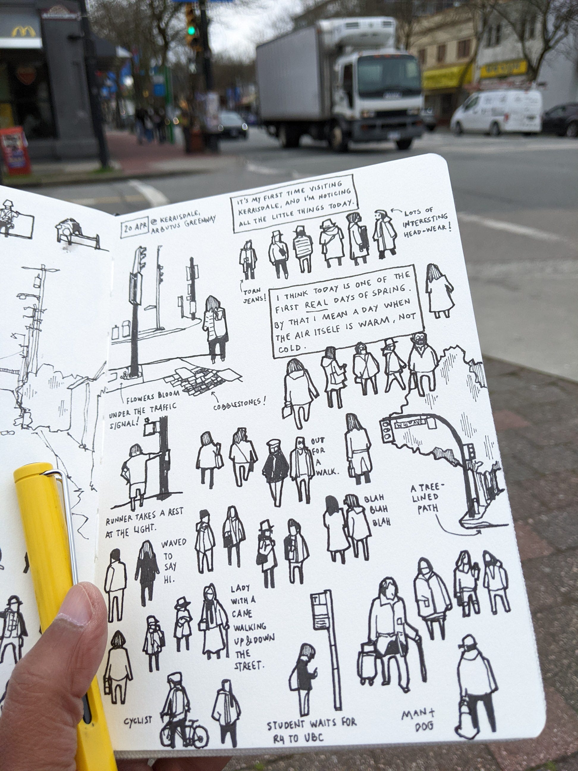 I also drew the day’s TinyPeople from that bench. There were people out for sunshine and groceries. There were several gaggles of high-school students. There were runners and cyclists travelling along the Arbutus Greenway. Kerrisdale looked beautiful and I took the time to observe the little things of beauty on this page.