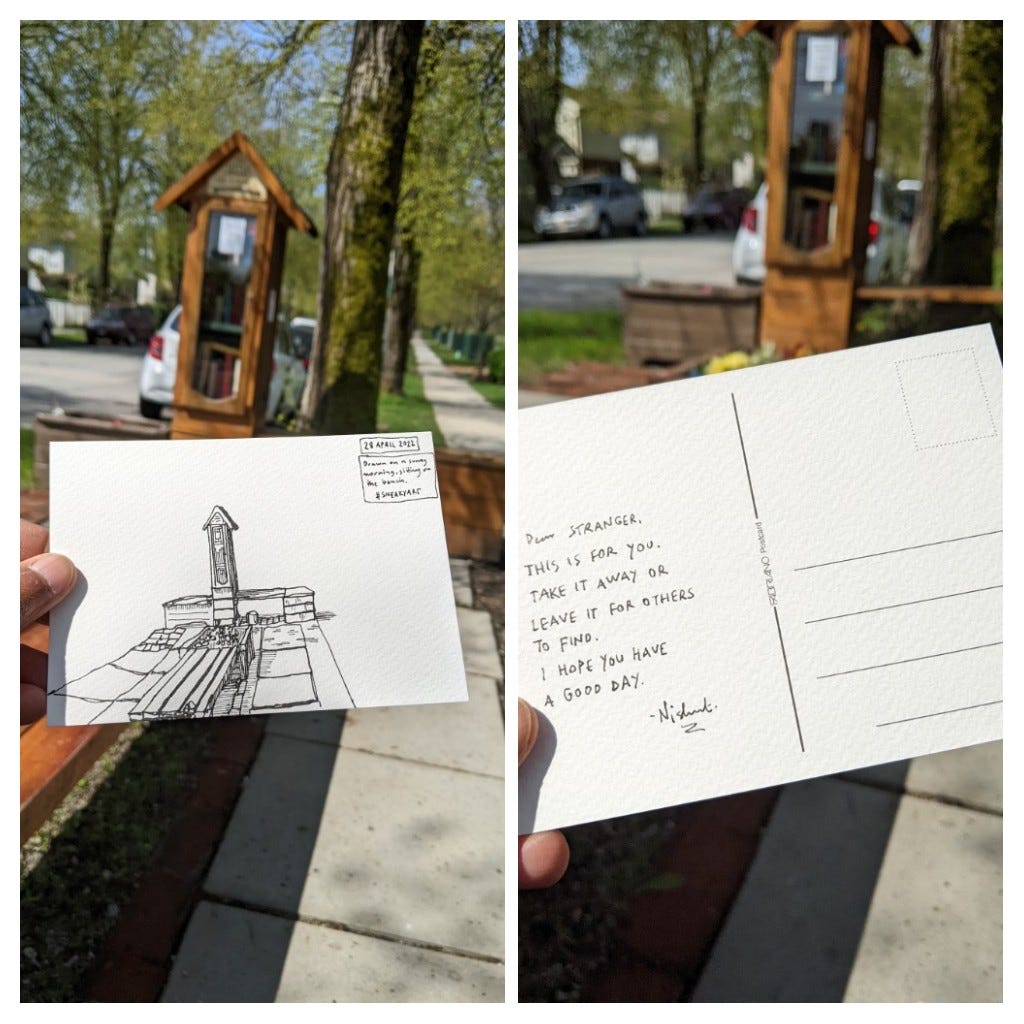 I saw a tiny lending library on the sidewalk on the way back. It was beautiful. I left a little drawing inside for a stranger to find.