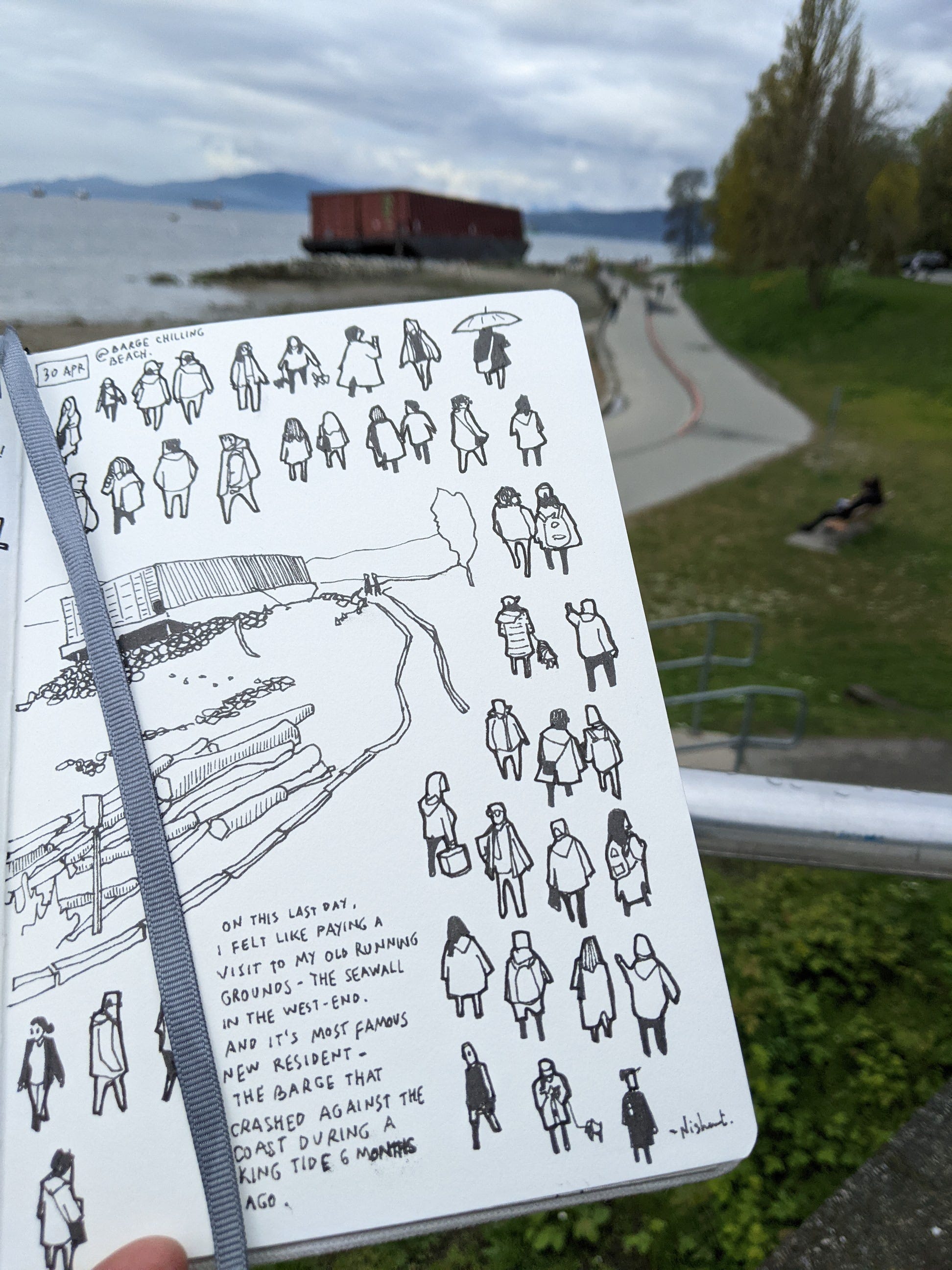Knowing that the good weather would lure them out of their homes, I went to draw tiny people at the sea wall. Since moving out of downtown, I have not been back to visit this part of the city.
