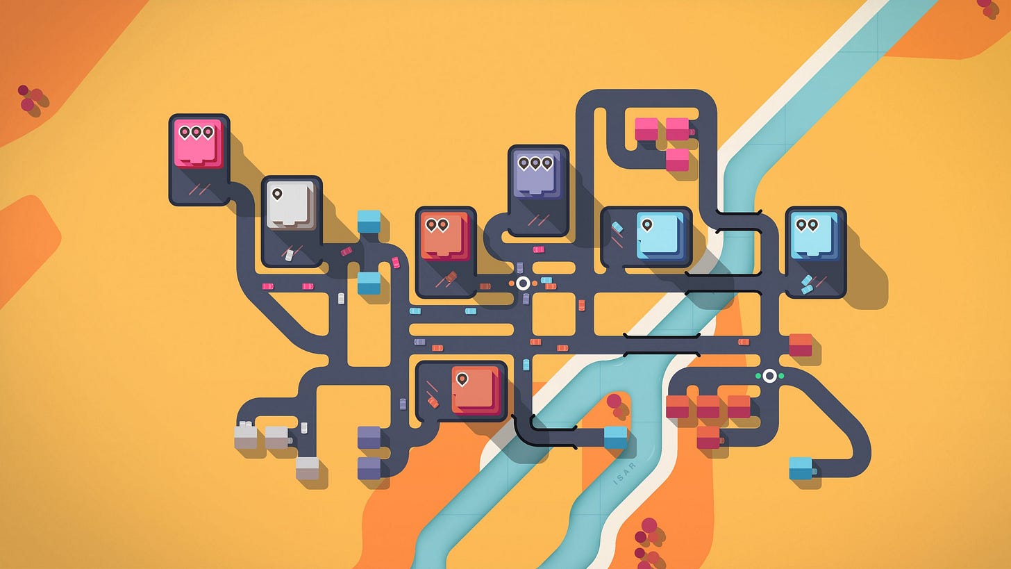 A second game I have enjoyed is called Mini Motorways - where you design road networks in fictionalized versions of famous cities around the world.