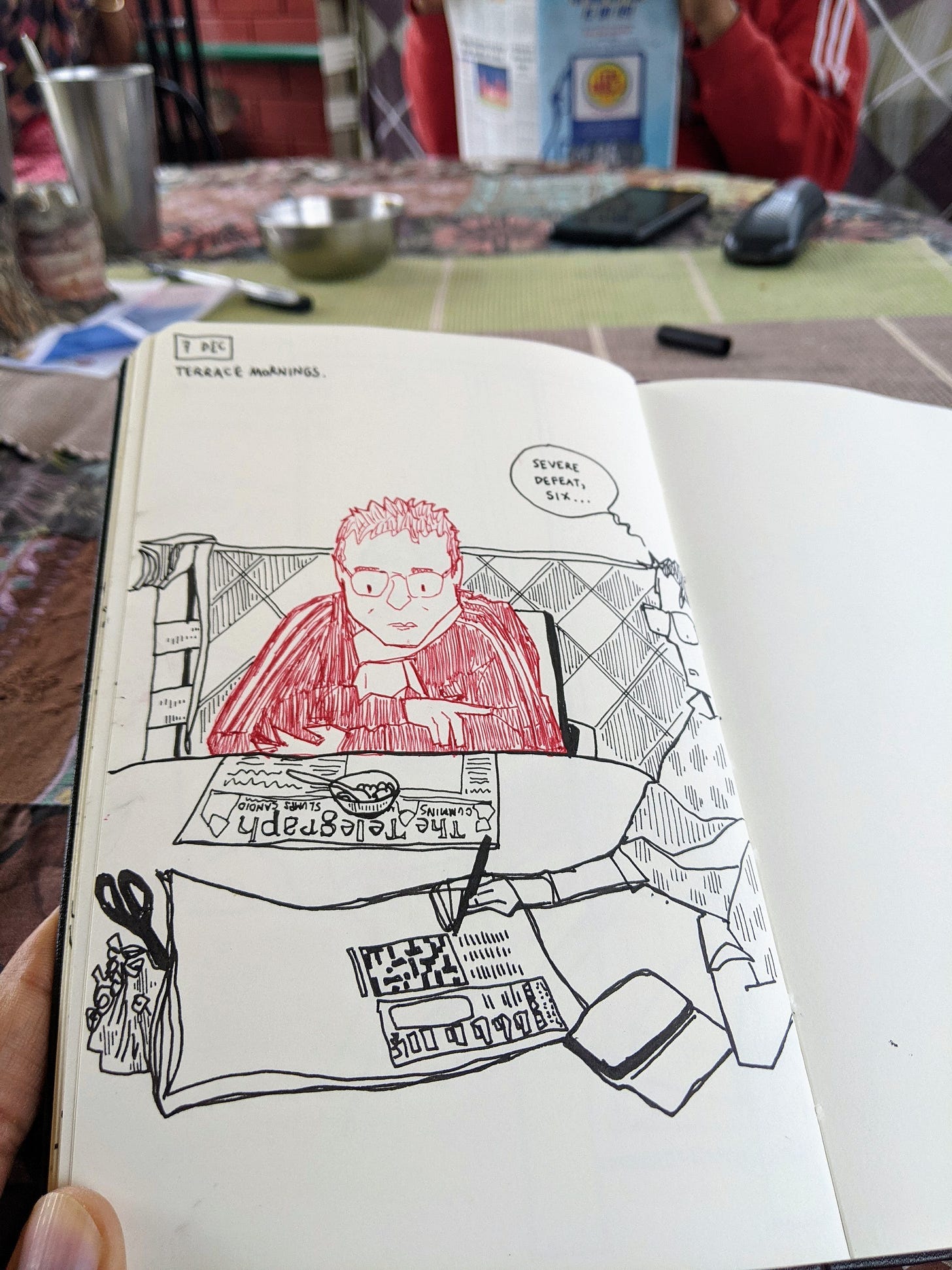 Every morning, I wake up before my parents. I watch them stagger out of the bedroom, and climb the steps to the terrace for the morning cup of tea. I observe that my mother, who used to bound up the steps with a spring, now takes each step more slowly. I try to remember her gait. We sit with the newspaper together and do the crossword. Every few minutes I lean back, to watch them poring over the clues. I try to remember the scene, exactly as it is. I try to breathe it in. If I notice everything, I tell myself, I can lock it inside my mind forever. Nothing can take it away then.