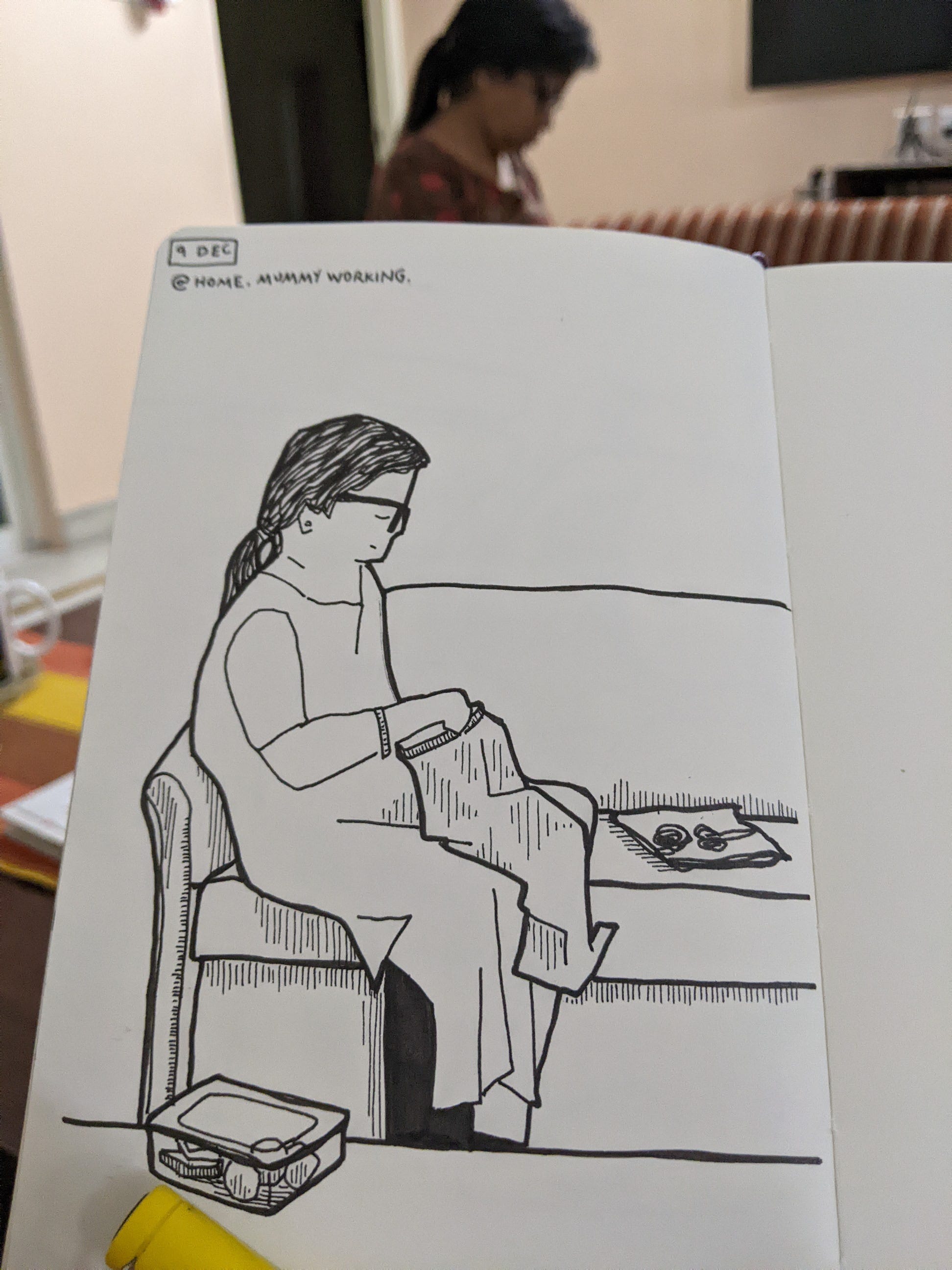 Very often, she also works here. This is a drawing I made of her last week, sewing a ‘formal mask’ for me to take to a family wedding.