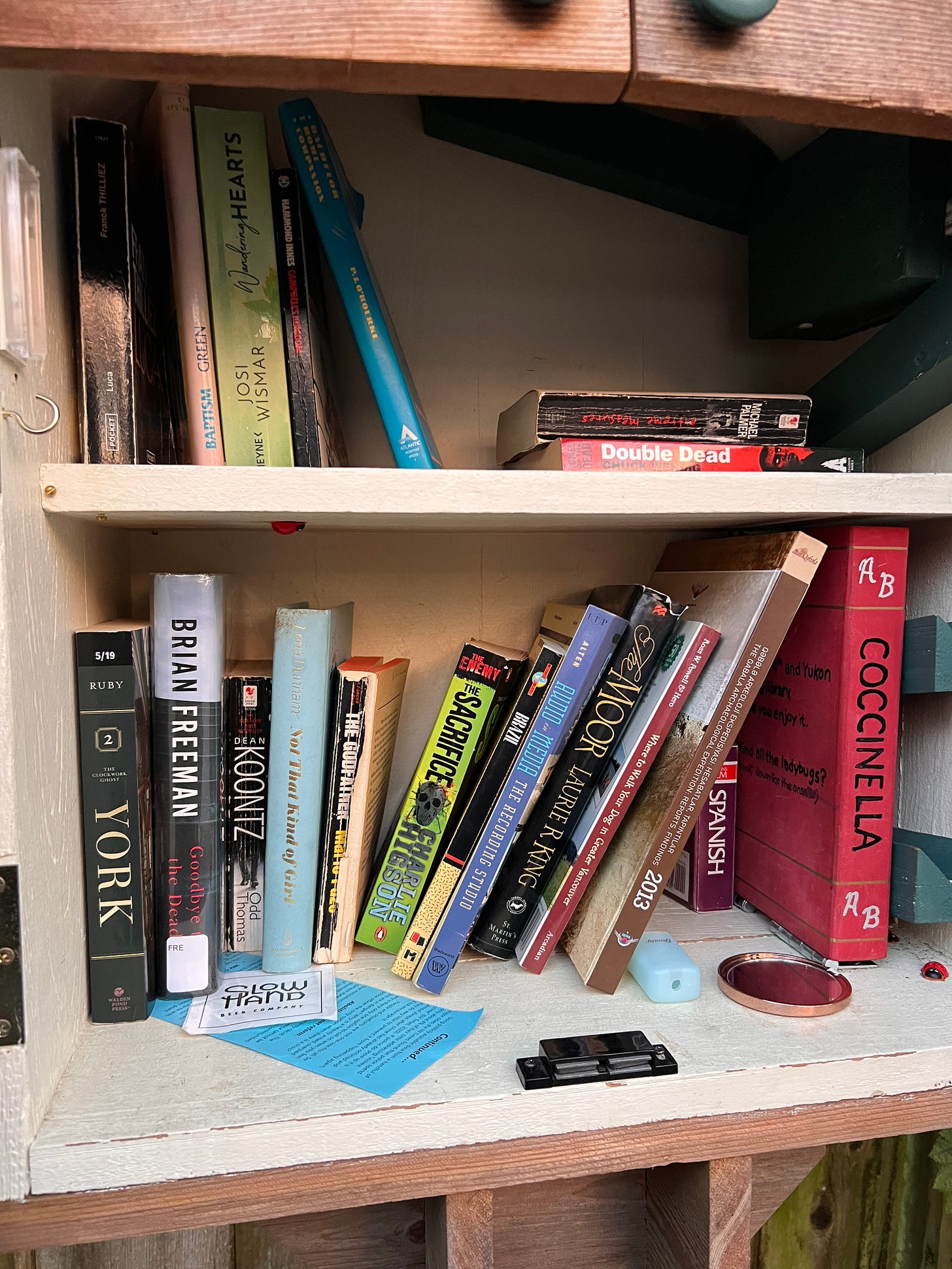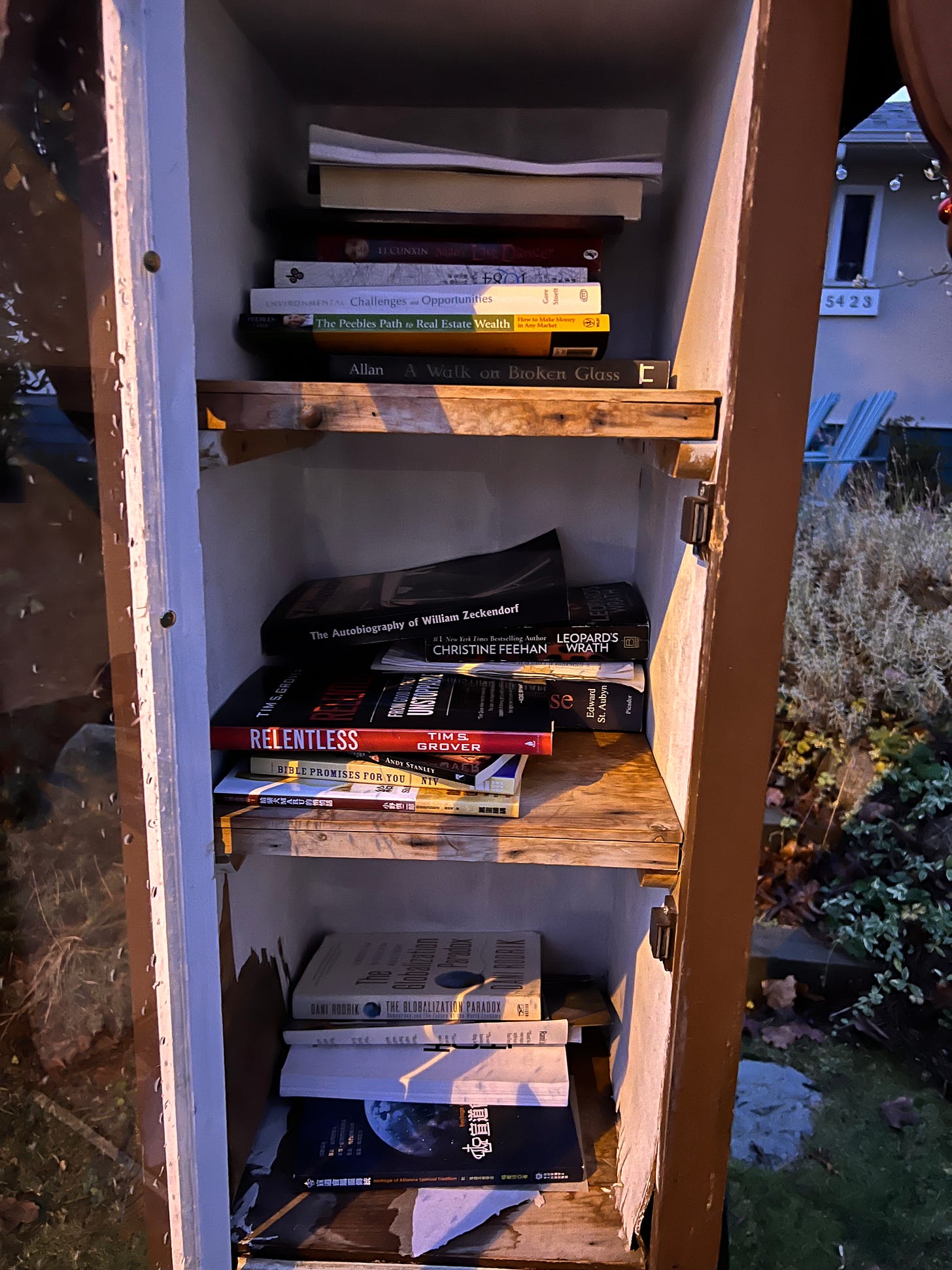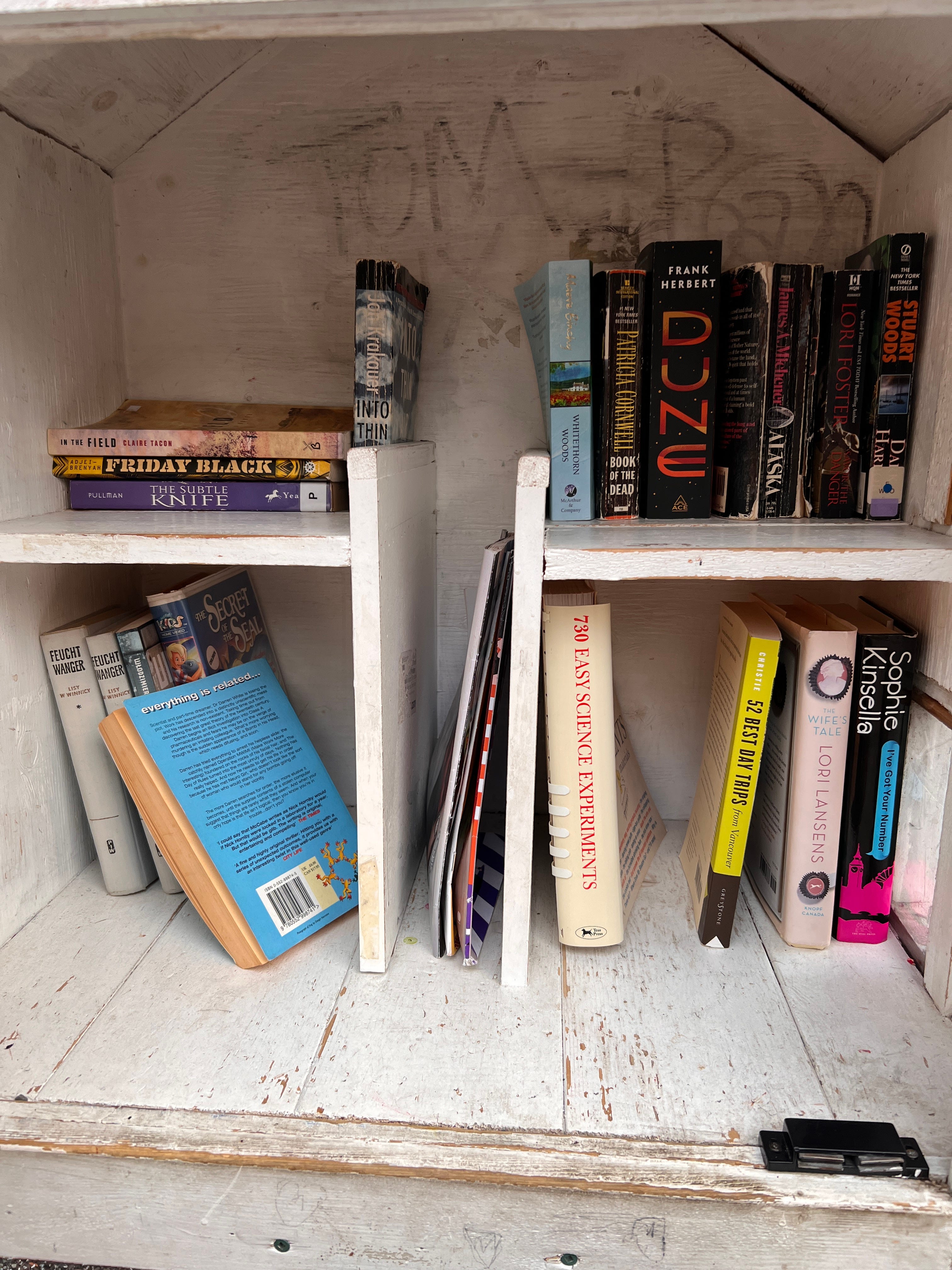 This street sees a lot of pedestrians and I often find people curiously looking inside this LFL. Somehow, I have never seen anyone leave a book. But every time I walk by, the collection is a little different.