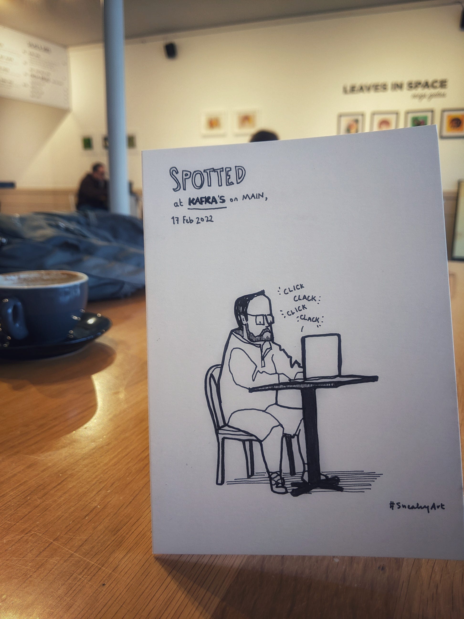 Below is February’s original art giveaway, as drawn in Kafka’s on Main St, on 17th February.