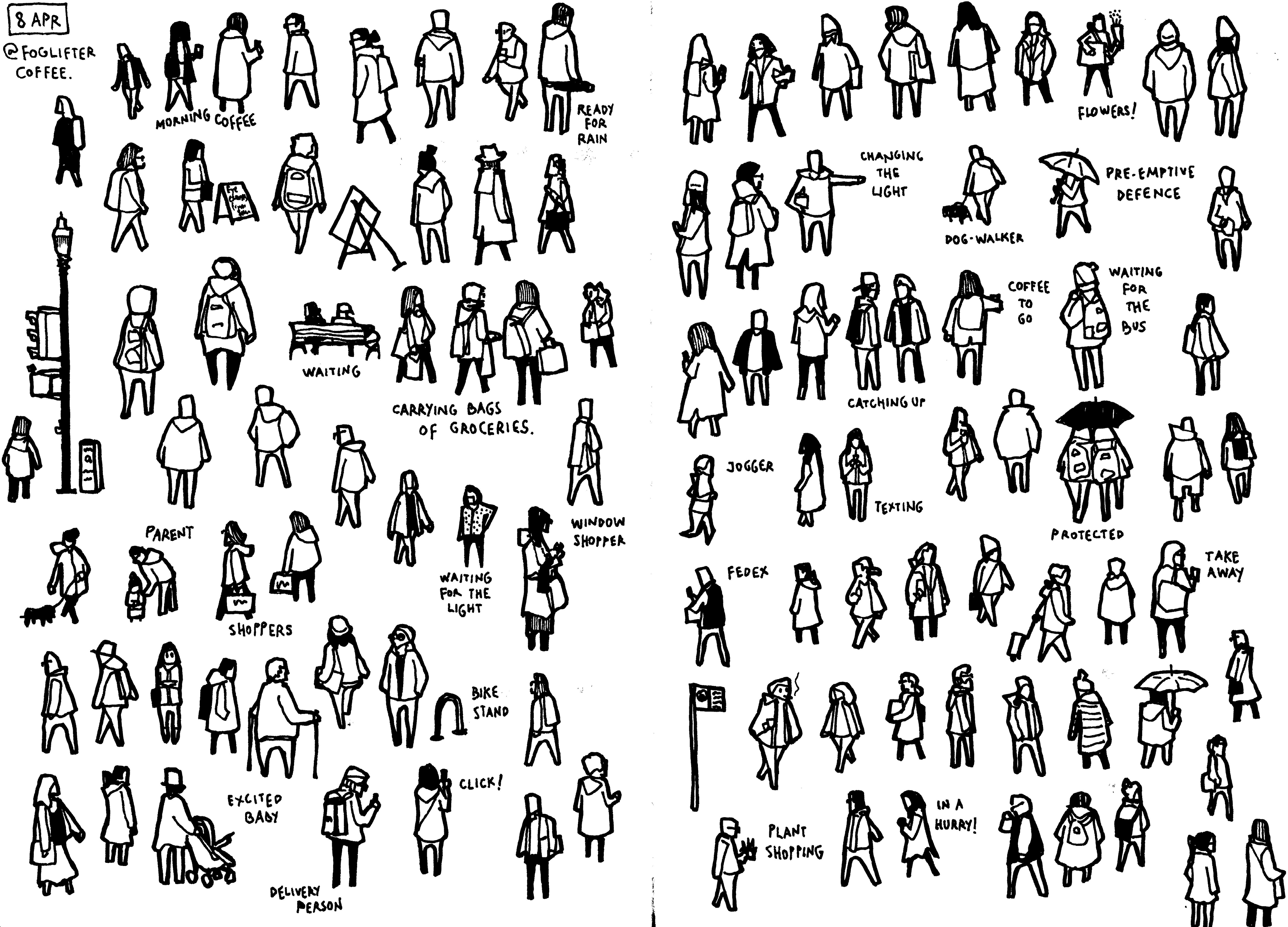 For example, the older person plant shopping in the bottom middle. I imagine he was sent out on an errand by his partner, to add a dash of green to their living room window. He was reluctant to go out in the cold, but is now enjoying his walk. Our homes can be like cocoons sometimes. Comfortable, but enclosing. We might need a push to go out, but we never regret it afterwards.