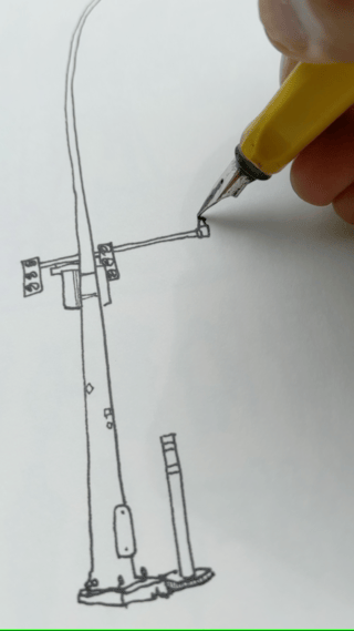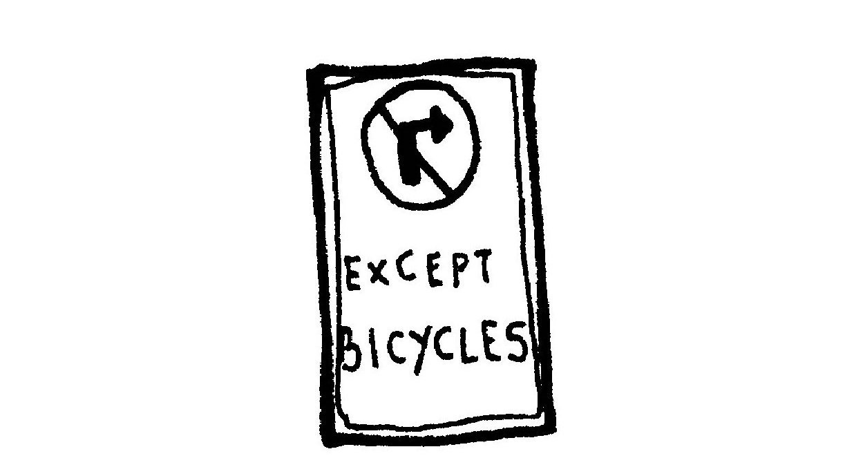 This week I made a drawing at a plaza in Cambie Village. It was a public space created by blocking the main street. A sign at the traffic light forbade any vehicles from taking a right turn while making an exception for bicycles.