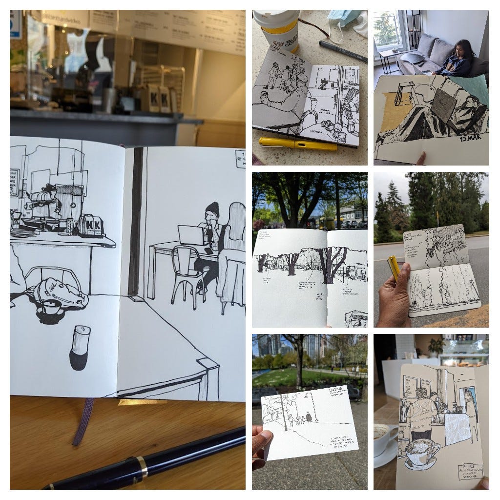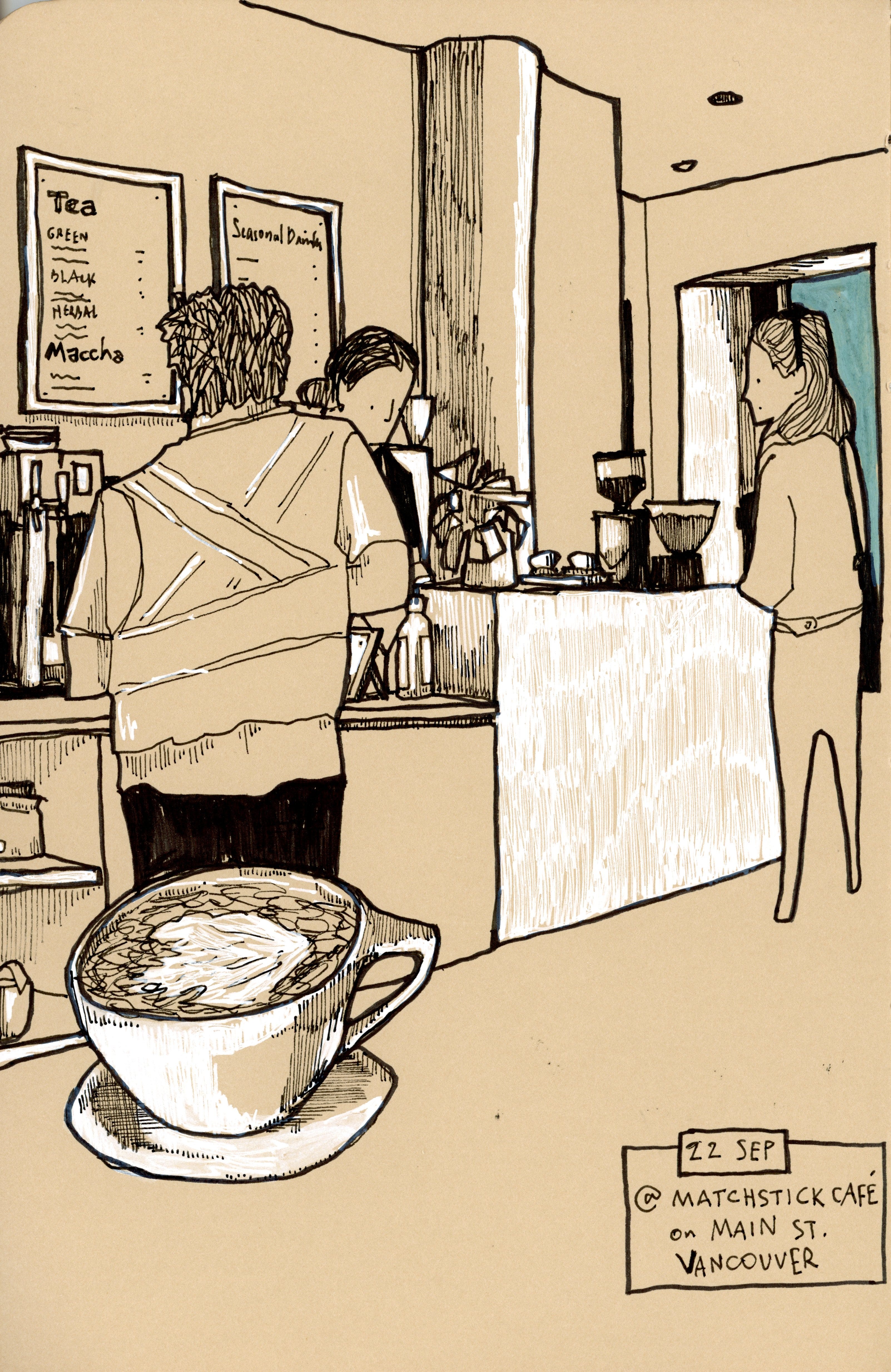 I think I see another difference with using toned paper. The white paper sketches tend to look more flat. Looking at the toned coffee shop, the rounded pillar being the barista and the coffee cup on your table, are more dimensional due to the white and black showing more contrast of sun and shadow. Do you notice a difference in that way?