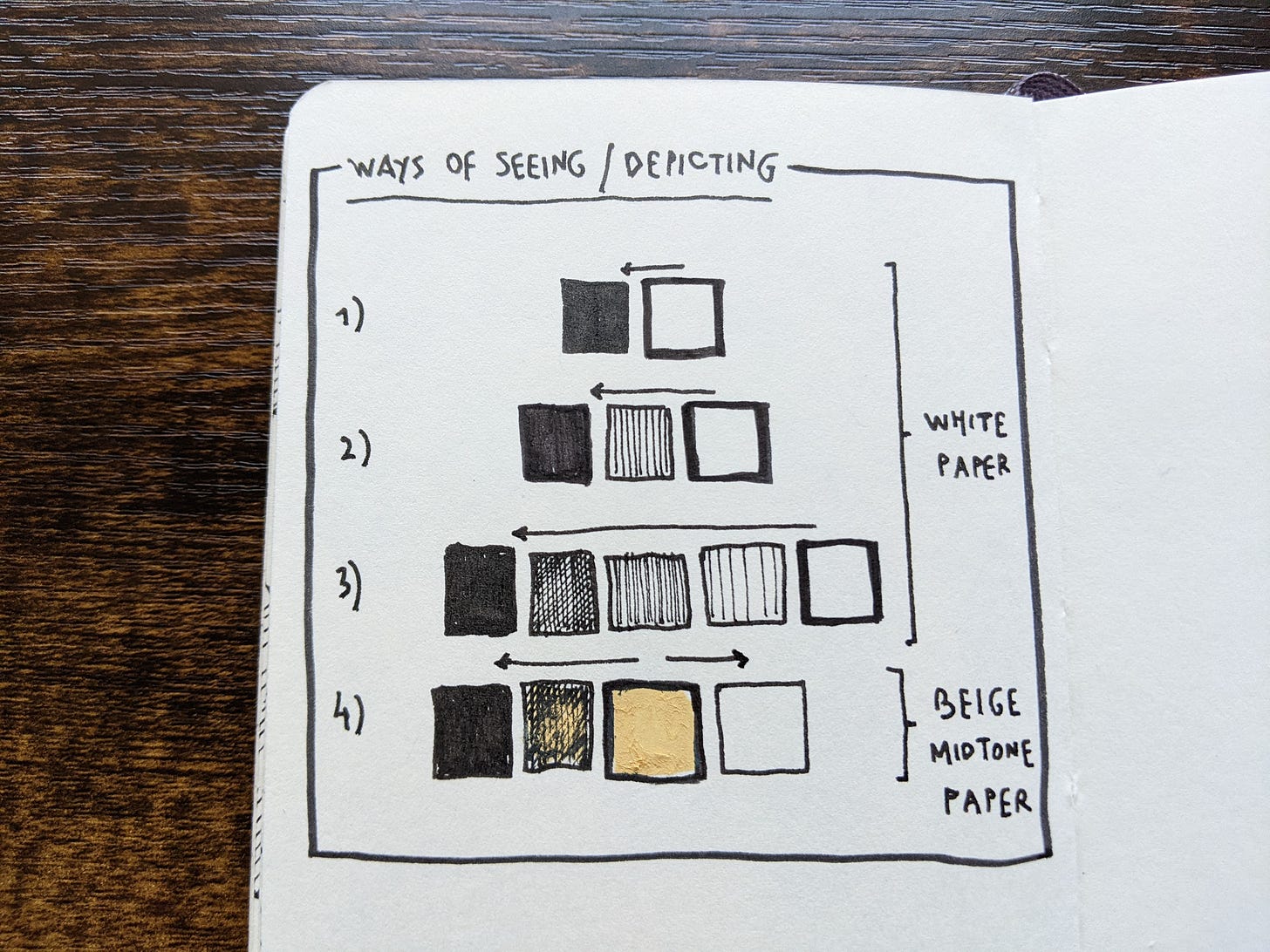 In (4), we see that beige is not at the end of the spectrum. It sits somewhere between pure light and pitch-dark. With my fountain pen (for black) and a gelly roll pen (for white), I go both left and right on the spectrum.
