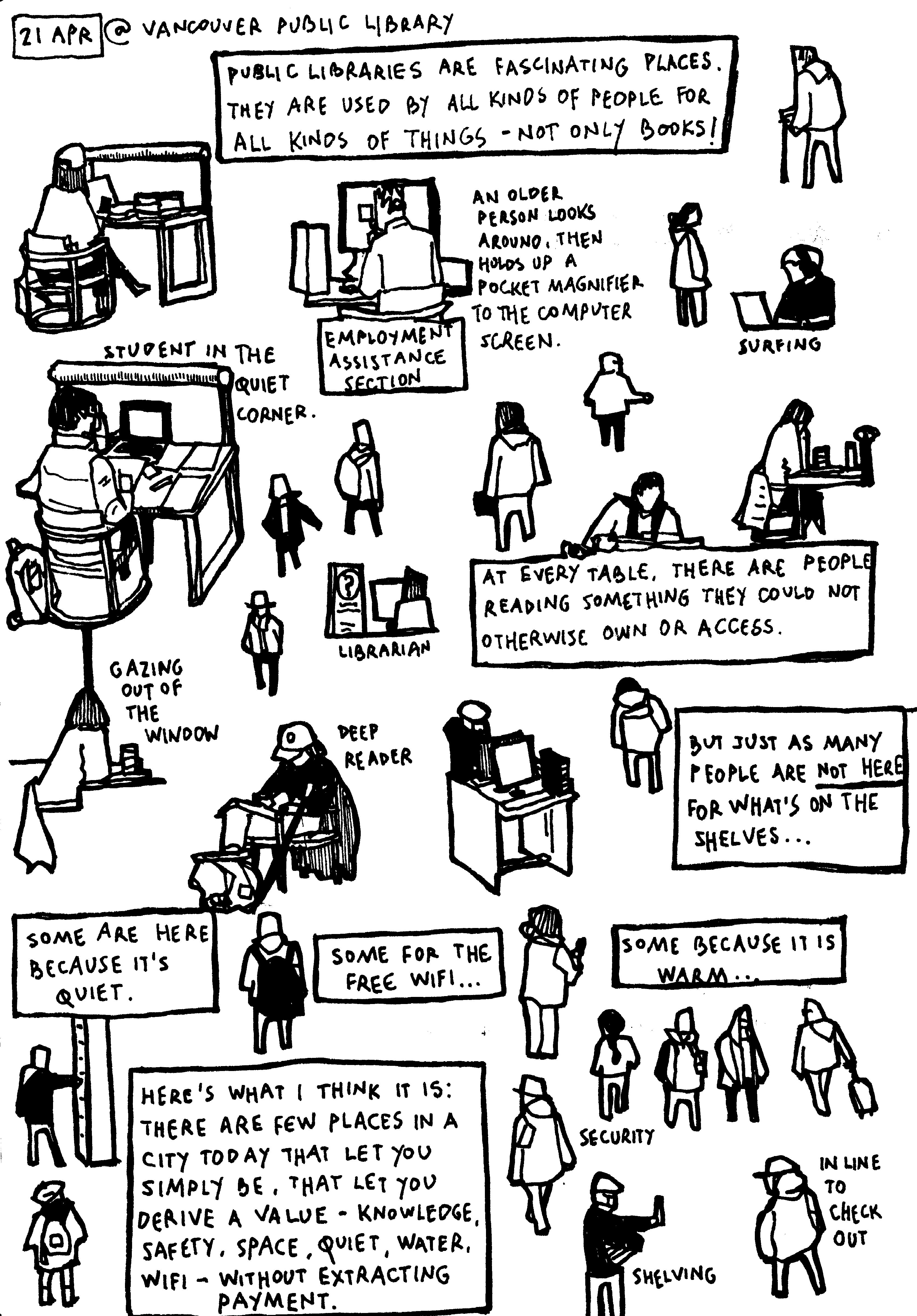 I love to visit the VPL. Earlier this year, I gave myself the time and space to think about the value of libraries in my life, how they have evolved in the digital age, and what they mean to people from other stratas of society.