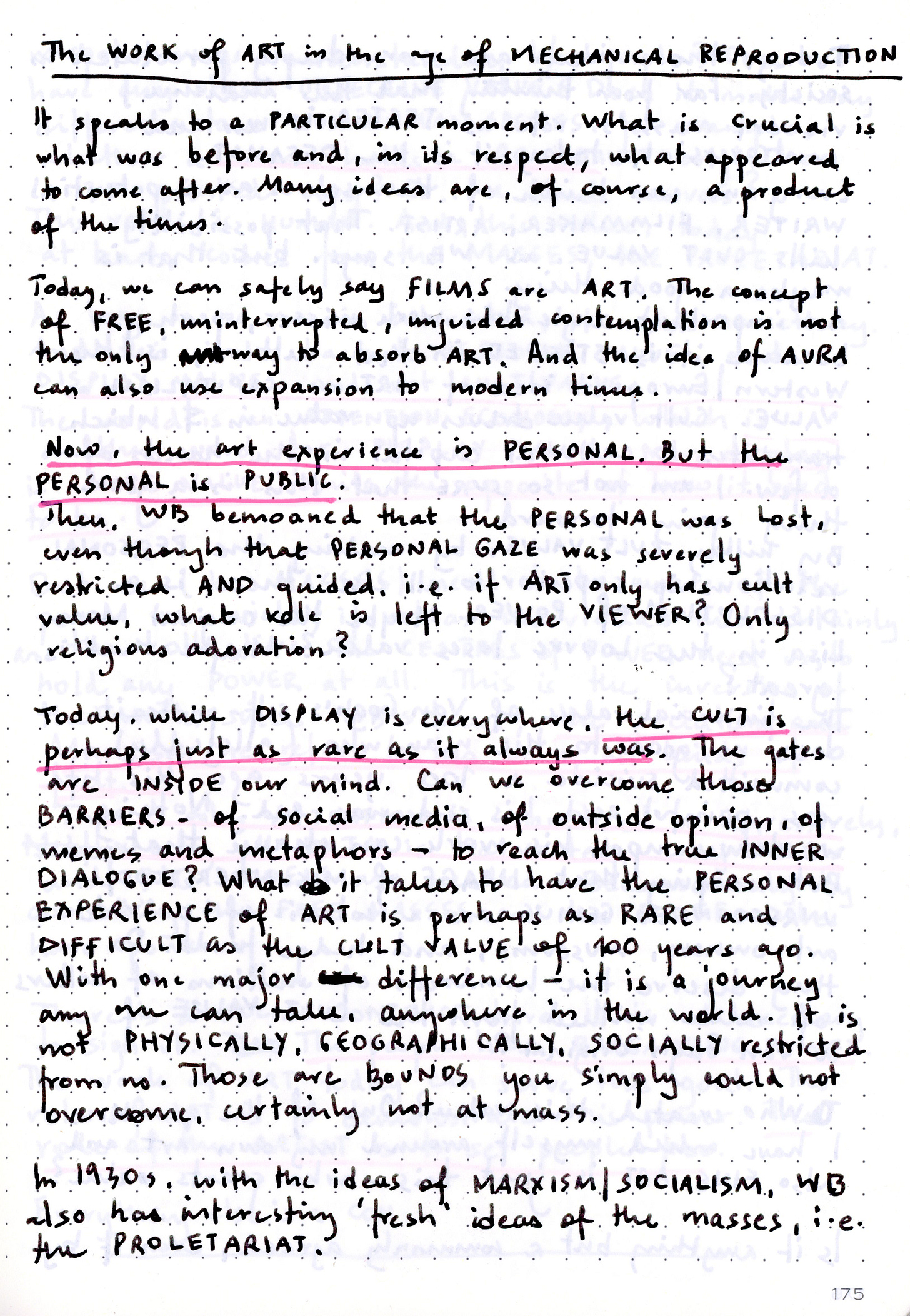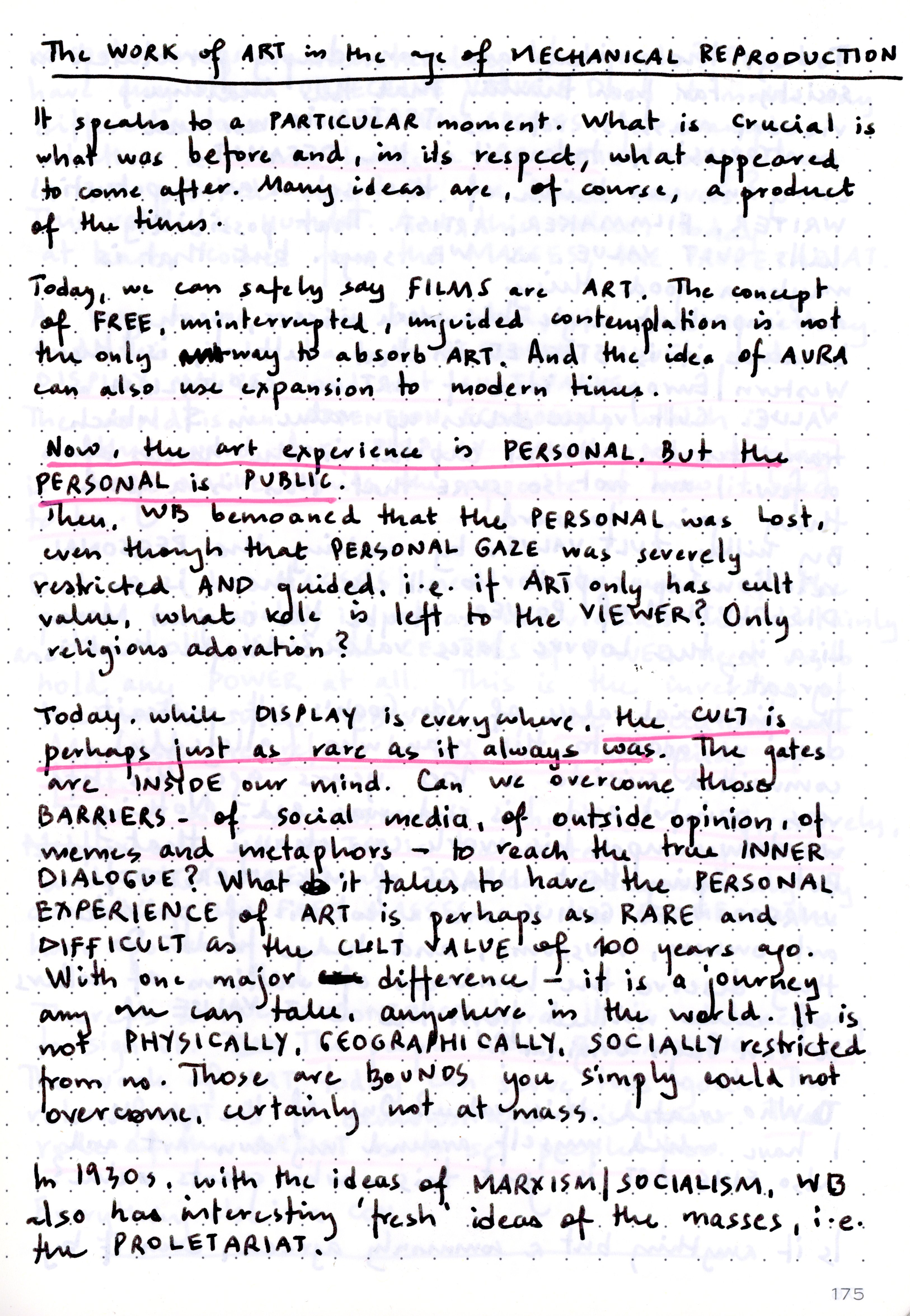 I am sharing a stream-of-consciousness piece written in my work-journal after completing Walter Benjamin’s 1936 essay, The Work of Art in the Age of Mechanical Reproduction. I want to edit it, sanitize it, and take out the parts that don’t make much sense. But I will not fear.