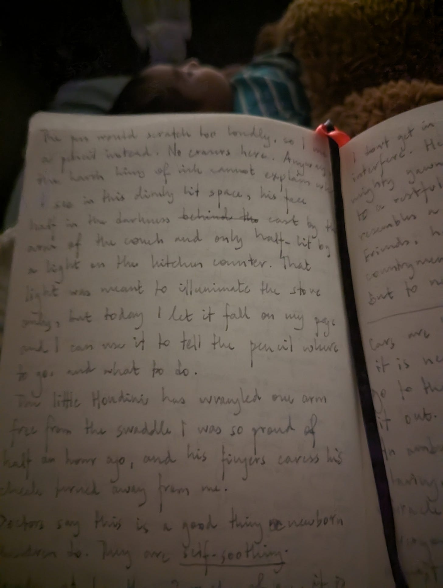 Another good line occurs to me, so I finally allow myself this - a notebook within arm’s reach, and light-grey ink on soft paper. If I write smoothly and never scratch anything out, maybe all of us can be happy - Rohan, in peaceful slumber, and the part of me that is watching over his 17th night of life, and the part of me that cannot let a good line go. Self-soothing.
