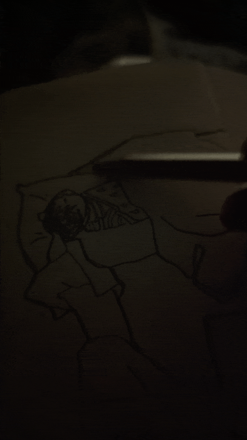 The pen would scratch on the sketchbook page. I use a pencil instead. Anyway, the harsh lines of ink cannot convey what I see in this dimly lit space, Rohan’s face half in the darkness cast by the arm of the couch and half-lit by the light above the kitchen counter. The light is meant to illuminate the stove-top, but today I let it fall on my page too. I use it to tell the pencil where to go and what to do.